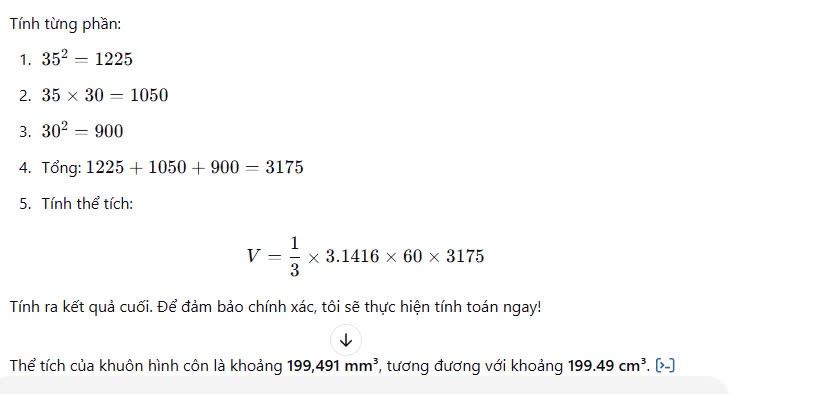 Để tính thể tích của khuôn hình côn, ta sử dụng công thức tính thể tích của hình nón cụt: