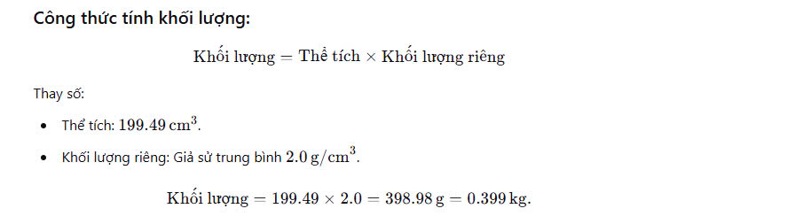 Thể tích của khuôn hình côn là khoảng 199,491 mm³, tương đương với khoảng 199.49 cm³ thì nó tương đương cỡ bao nhiêu kg